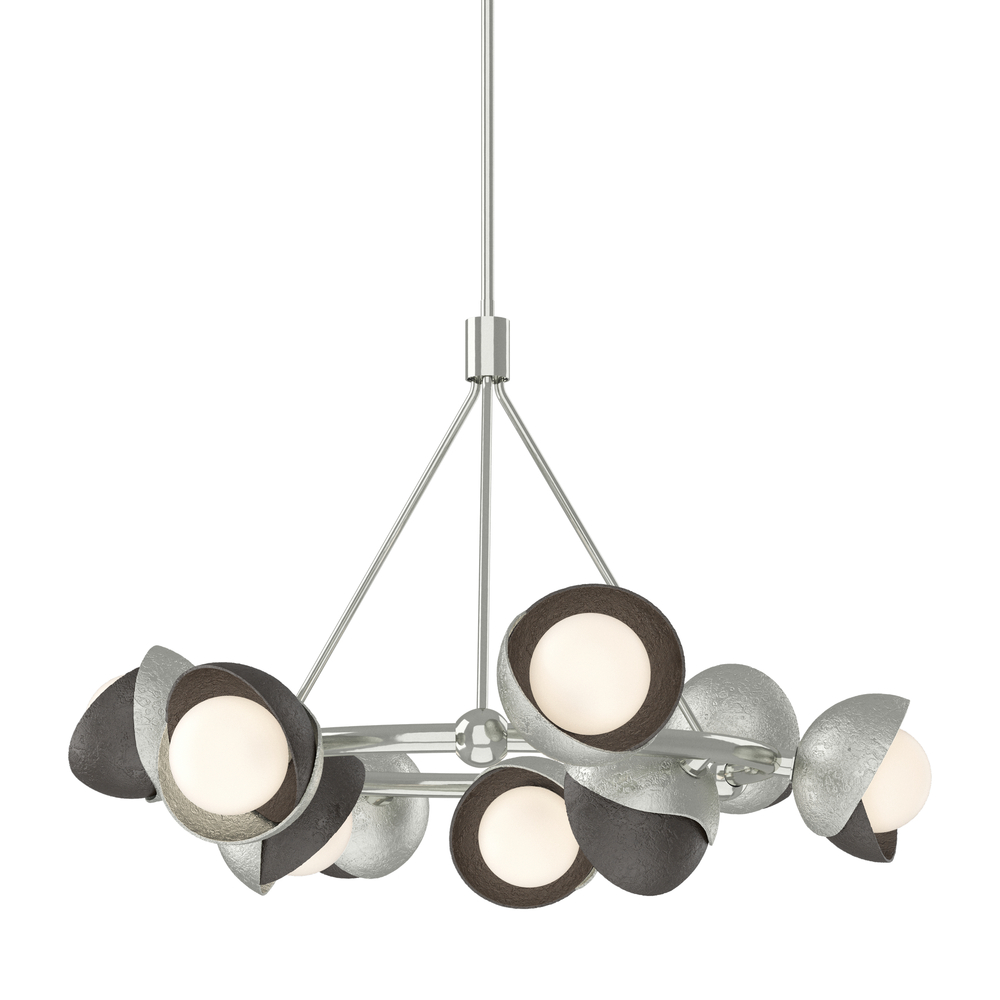 The Brooklyn Ring Pendant is a 9-light hanging fixture with a double shaded design in a circular configuration. A two-tone finish, featuring any of our 11 standard interior finish options, is available for the hand-forged and textured shades, crafted by artisans in Vermont. Multi-directional opal globes are nestled within the Brooklyn’s shades offer optimal lighting effect.